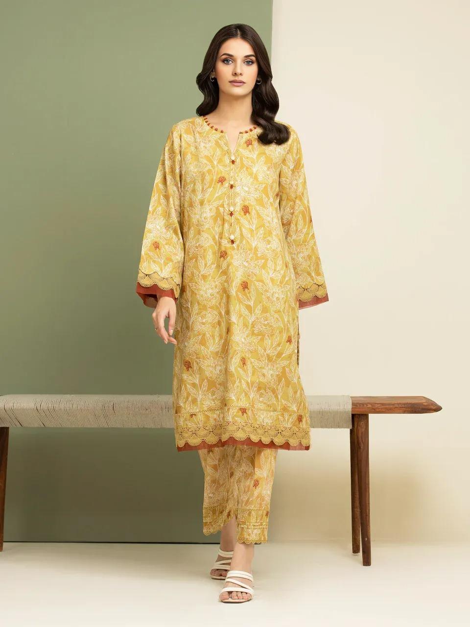 Crafted from high-quality, breathable lawn fabric, this outfit features soft floral and leaf patterns across a radiant mustard base — a perfect reflection of refined charm and confidence. The rust-toned lace detailing on the sleeves and neckline enhances its rich, traditional look, while maintaining a modern silhouette ideal for every occasion.
